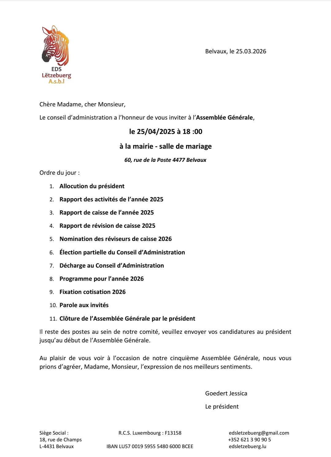zeréck 25.04.2026 Generalversammlung iwwert d'Joer 2025 De 27 Mäerz ass eis Aluedung un eis aktiv Memberen eraus gaangen